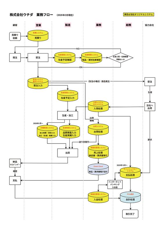 併せて、見積システムを構築し既存の受注・発注システムと連結させました。さらに新販売管理システムにより既存の各種システムの情報を会計システム(PCA)に連動できるようにしました。これにより「見積システム→受注・発注システム→生産管理システム→入荷・仕入システム→在庫管理システム→出荷システム→新販売管理システム→(DirectCloud)→会計システム(PCA)」(下記業務フロ-参照)という、入口から出口までの一気通貫の新たな業務システムが完成しました。又、新販売管理システムではインボイス制度や電子帳簿保存法等の電子請求にも対応可能なシステムになっています。